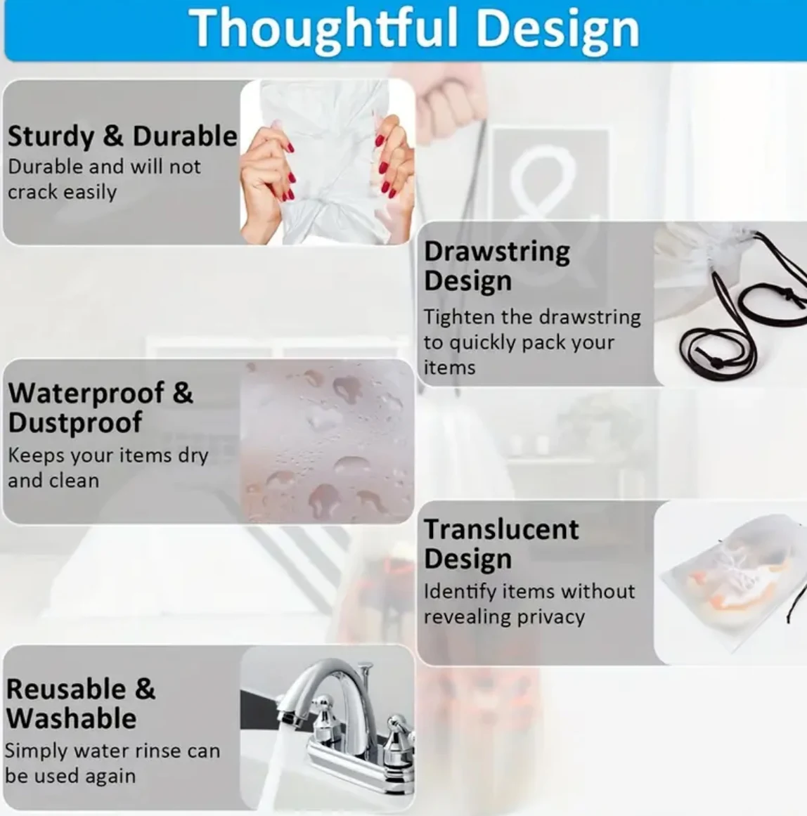 Keep your shoes clean and your clothes cleaner! Footloose Shoe Bags are the easy way to separate shoes from everything else in your luggage.