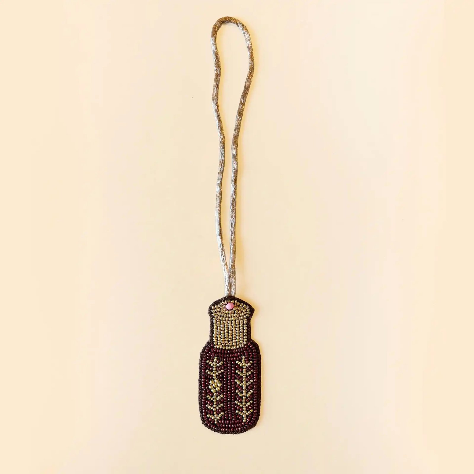 Luxurious oud-bottle?inspired charm made with rich, detailed beadwork. Adds an elegant Middle Eastern flair to your accessories.