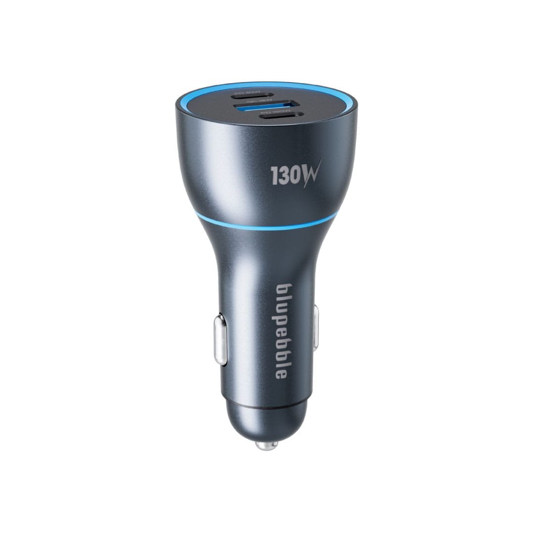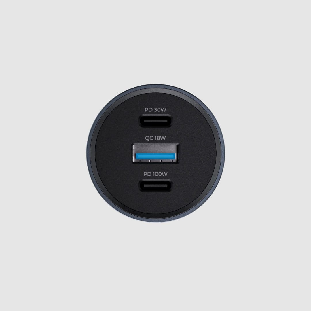 High-speed 130W car charger with dual USB-C ports – one up to 100W and the other 30W – plus QC 18W support. Built from durable aluminum, ideal for charging laptops, phones, and tablets while on the road.